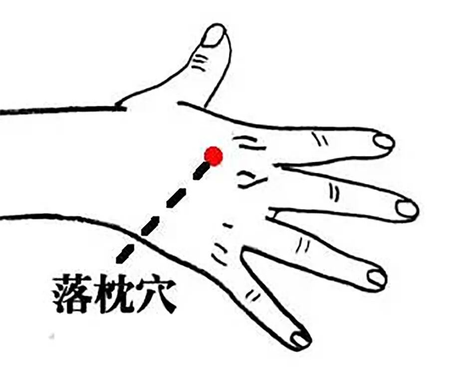 4、以拇指或食指点按落枕穴(手背第2、3掌骨间,指掌关节后5分处),待有酸胀感觉时再持续2-3分钟。